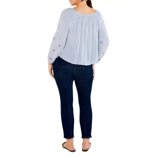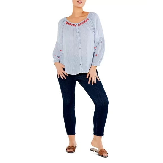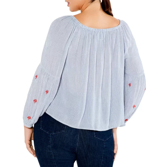 - Drop shoulders, bracelet sleeves with embroidered detail and elasticized cuffs